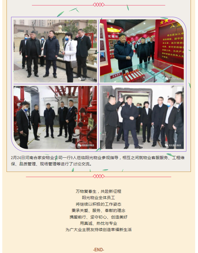 陽(yáng)光物業(yè)成立于2003年5月,專注物業(yè)服務(wù)行業(yè)20余載,陽(yáng)光物業(yè)現(xiàn)為河南省物業(yè)管理協(xié)會(huì)副會(huì)長(zhǎng)單位、商丘市物業(yè)管理協(xié)會(huì)副會(huì)長(zhǎng)單位,公司注冊(cè)資金1020萬(wàn)元,陽(yáng)光物業(yè)連續(xù)多年被河南省及商丘市評(píng)為先進(jìn)企業(yè)、優(yōu)秀企業(yè)。