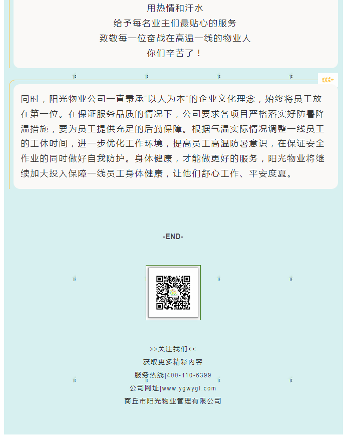 陽光物業(yè)成立于2003年5月,專注物業(yè)服務(wù)行業(yè)20余載,陽光物業(yè)現(xiàn)為河南省物業(yè)管理協(xié)會副會長單位、商丘市物業(yè)管理協(xié)會副會長單位,公司注冊資金1020萬元,陽光物業(yè)連續(xù)多年被河南省及商丘市評為先進企業(yè)、優(yōu)秀企業(yè)。