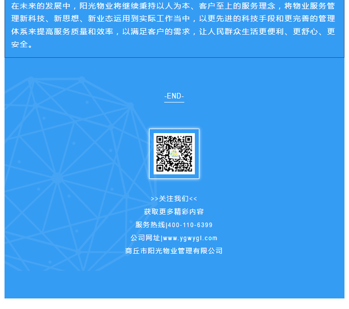 陽光物業(yè)成立于2003年5月,專注物業(yè)服務行業(yè)20余載,陽光物業(yè)現為河南省物業(yè)管理協(xié)會副會長單位、商丘市物業(yè)管理協(xié)會副會長單位,公司注冊資金1020萬元,陽光物業(yè)連續(xù)多年被河南省及商丘市評為先進企業(yè)、優(yōu)秀企業(yè)。