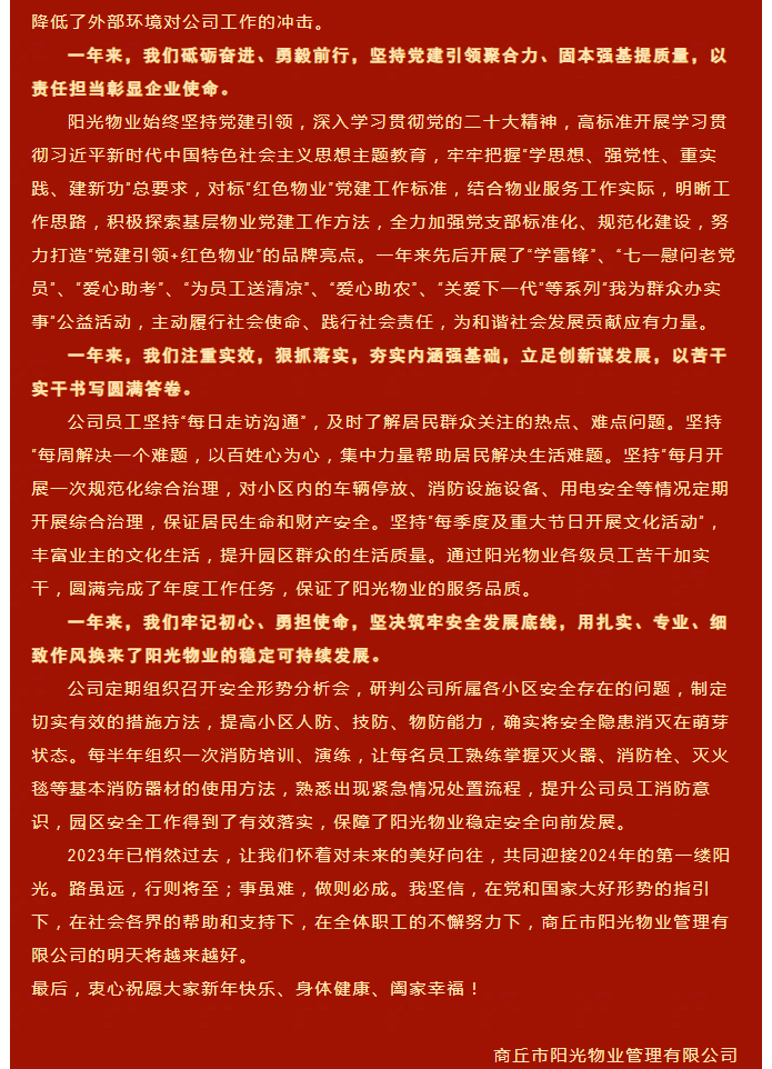 陽光物業(yè)成立于2003年5月,專注物業(yè)服務(wù)行業(yè)20余載,陽光物業(yè)現(xiàn)為河南省物業(yè)管理協(xié)會副會長單位、商丘市物業(yè)管理協(xié)會副會長單位,公司注冊資金1020萬元,陽光物業(yè)連續(xù)多年被河南省及商丘市評為先進(jìn)企業(yè)、優(yōu)秀企業(yè)。