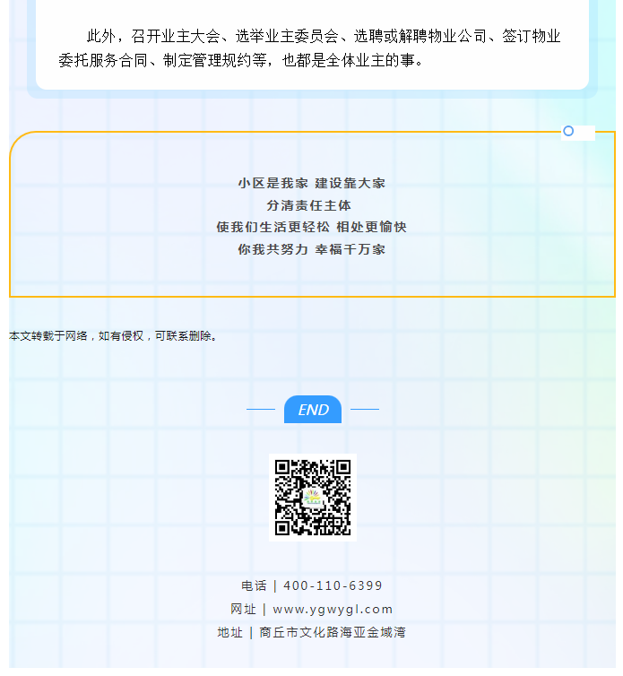 陽(yáng)光物業(yè)成立于2003年5月,專注物業(yè)服務(wù)行業(yè)20余載,陽(yáng)光物業(yè)現(xiàn)為河南省物業(yè)管理協(xié)會(huì)副會(huì)長(zhǎng)單位、商丘市物業(yè)管理協(xié)會(huì)副會(huì)長(zhǎng)單位,公司注冊(cè)資金1020萬(wàn)元,陽(yáng)光物業(yè)連續(xù)多年被河南省及商丘市評(píng)為先進(jìn)企業(yè)、優(yōu)秀企業(yè)。