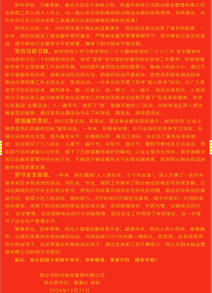陽光物業(yè)成立于2003年5月,專注物業(yè)服務(wù)行業(yè)20余載,陽光物業(yè)現(xiàn)為河南省物業(yè)管理協(xié)會副會長單位、商丘市物業(yè)管理協(xié)會副會長單位,公司注冊資金1020萬元,陽光物業(yè)連續(xù)多年被河南省及商丘市評為先進(jìn)企業(yè)、優(yōu)秀企業(yè)。
